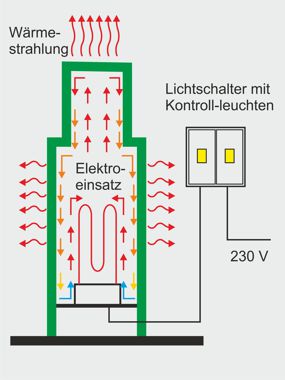 Bei eingeschalteter Heizung wird die Luft innerhalb des Kachelofen aufgeheizt.
